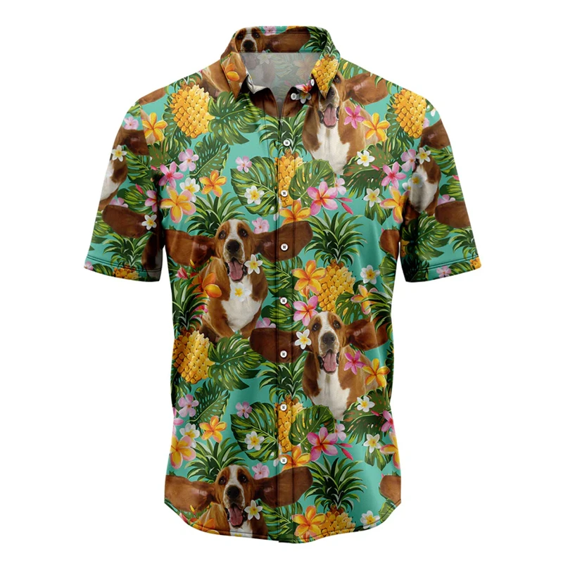 Cute Basset Hound Hawaiian shirt with 3D dog print. Oversized, casual short sleeve top perfect for summer, vacations, and dog lover everyday fashion.