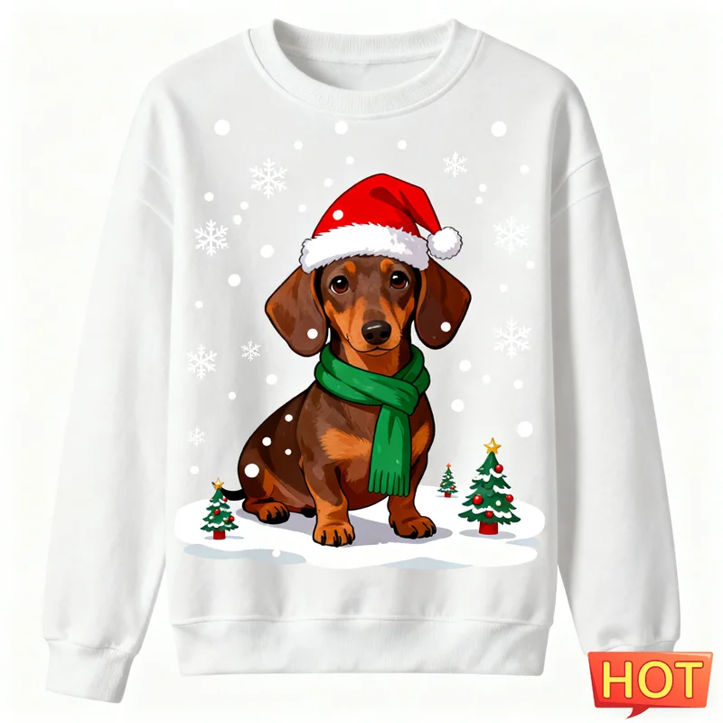 • Festive Dachshund Crew Neck Design: Fun 3D printed dog graphic perfect for holiday celebrations.