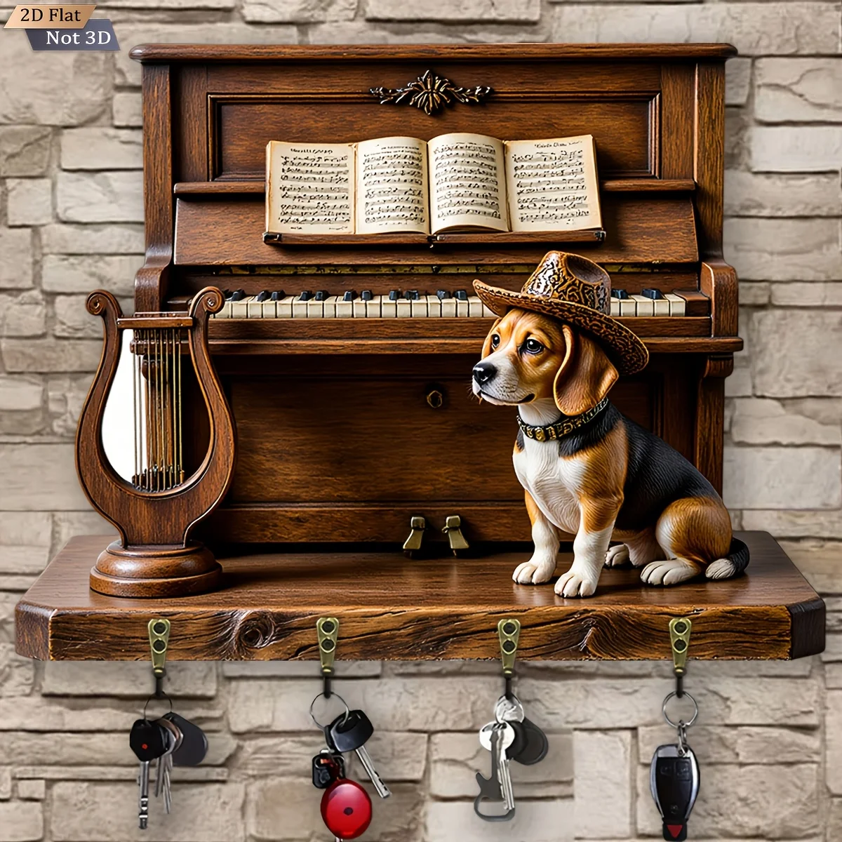 2D Flat Retro Music Puppy Key Hook – Wooden Wall Key Rack with 4 Metal Hooks for Home Decor