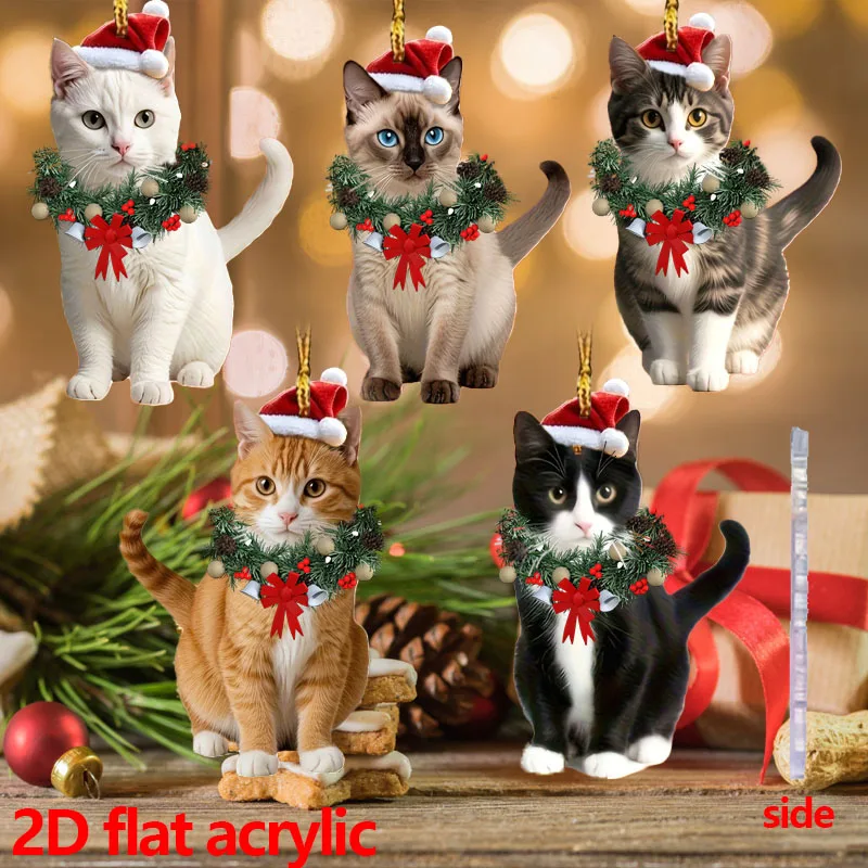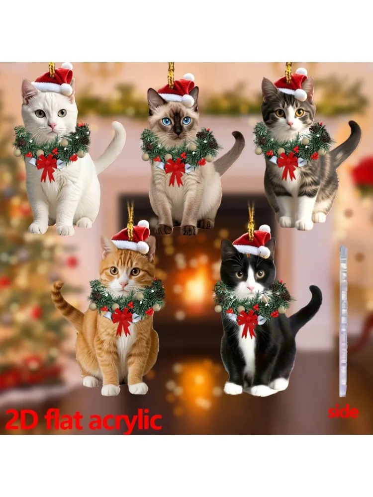 5 Pcs Christmas Cat Ornaments – Acrylic Cats with Hats Tree Decorations