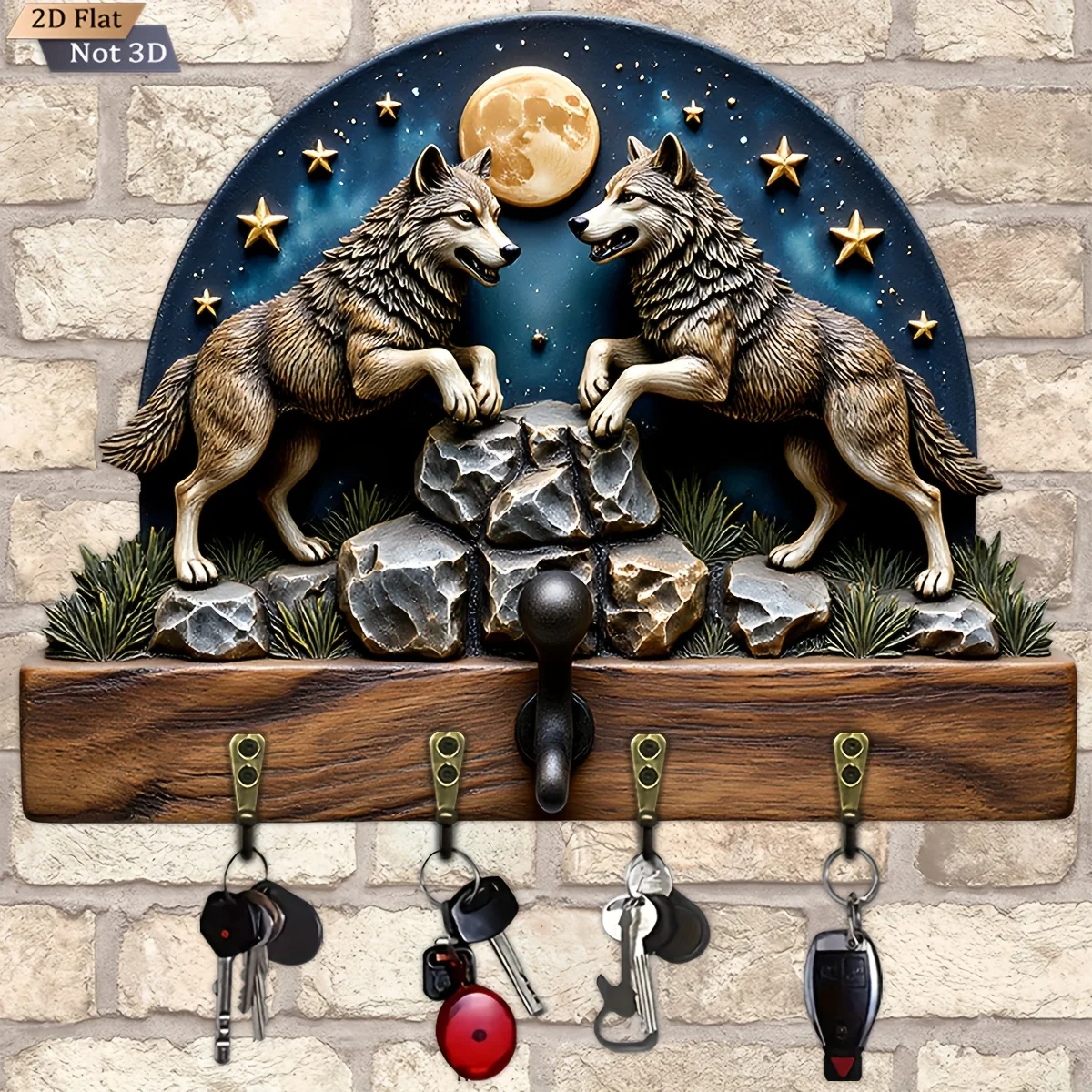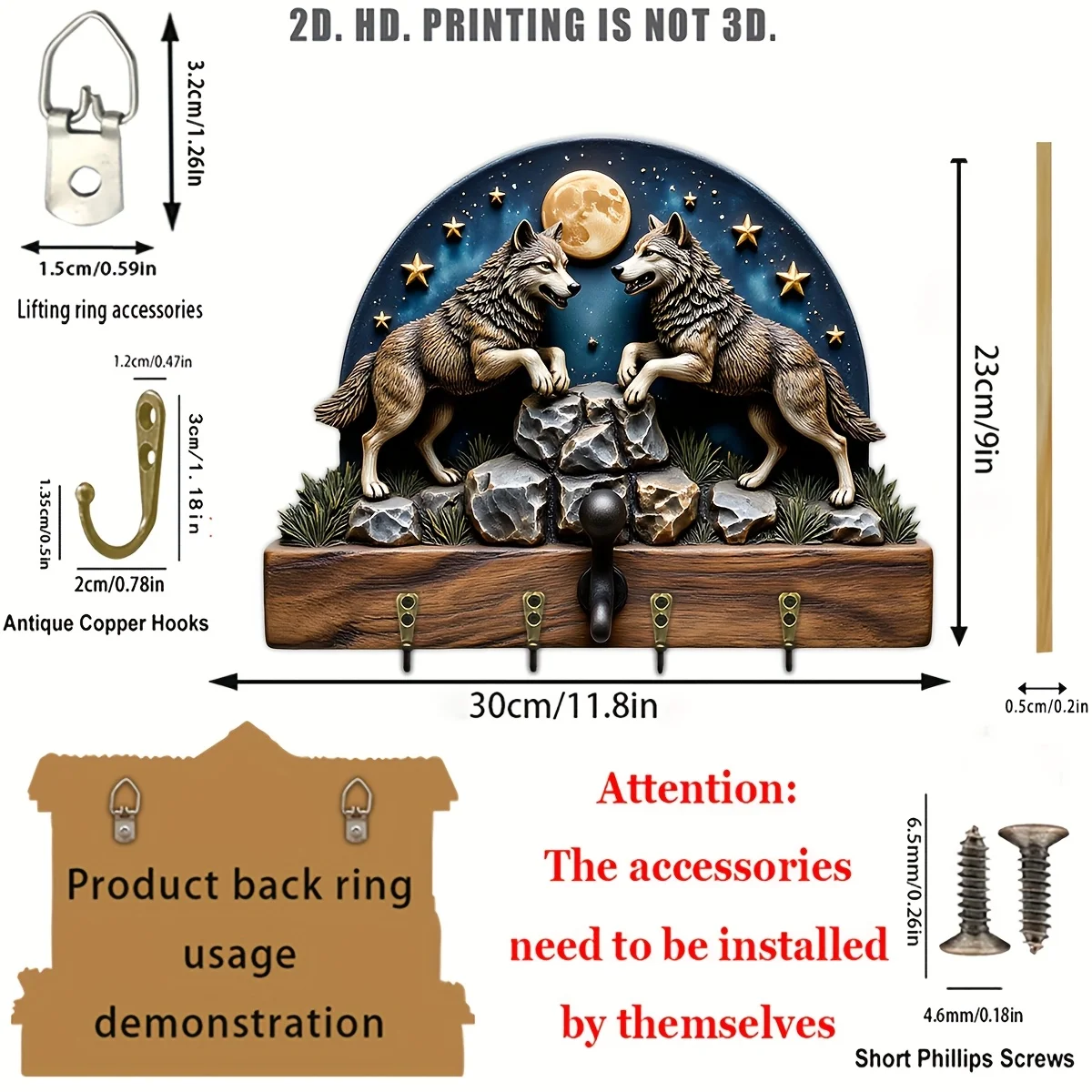 Double Wolf Moonlit Wooden Key Hook with 4 Metal Hooks Wall Decor