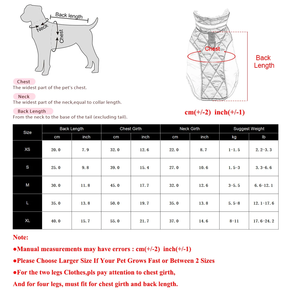 XL:Back Length 40cm/(15.7 inch);Chest Girth 55cm/(21.7 inch).Neck Girth:37cm/(14.6 inch),Suggest Weight:8-11kg(17.6-24.2lb);