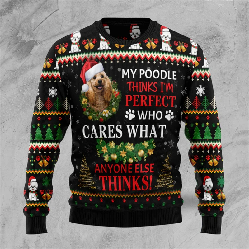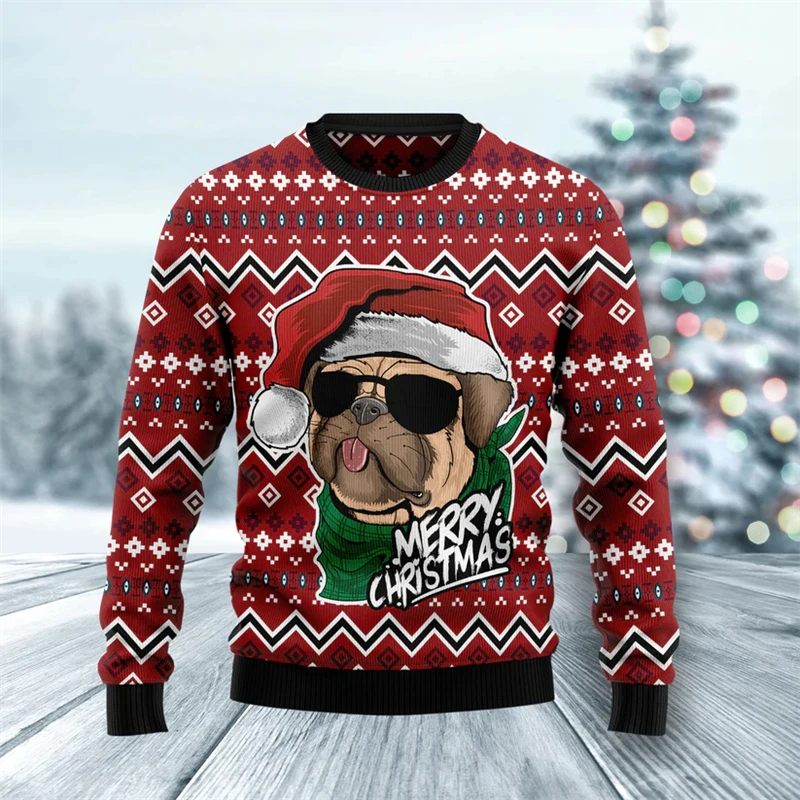 Funny dog ugly Christmas sweater with 3D print. Loose, comfortable pullover perfect for autumn, holiday parties, casual streetwear, and festive outfits.