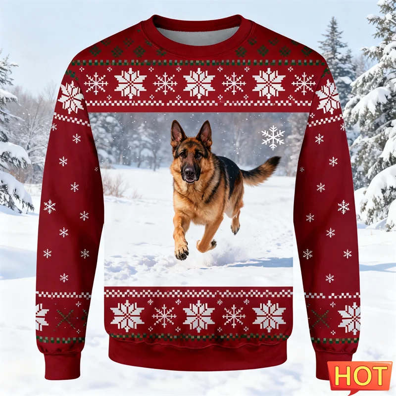• Festive German Shepherd Design: Features a cute 3D printed dog graphic perfect for holiday cheer.