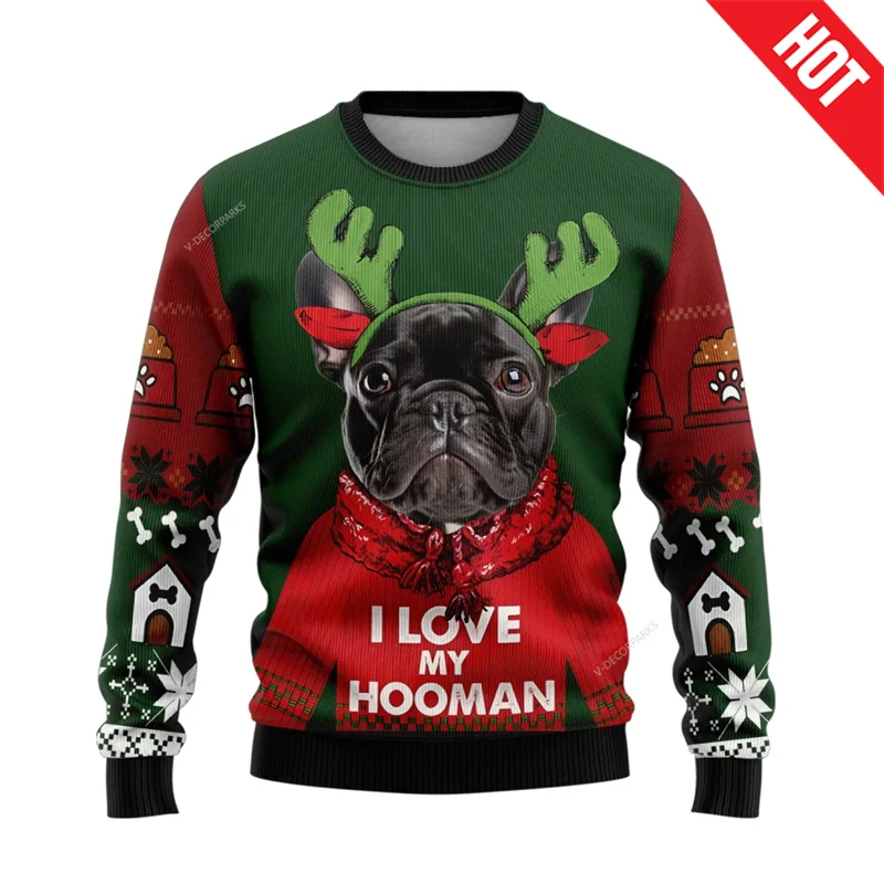 Funny ugly Christmas sweater with cow and dog design. Comfortable crew neck pullover perfect for men, women, and festive holiday celebrations.