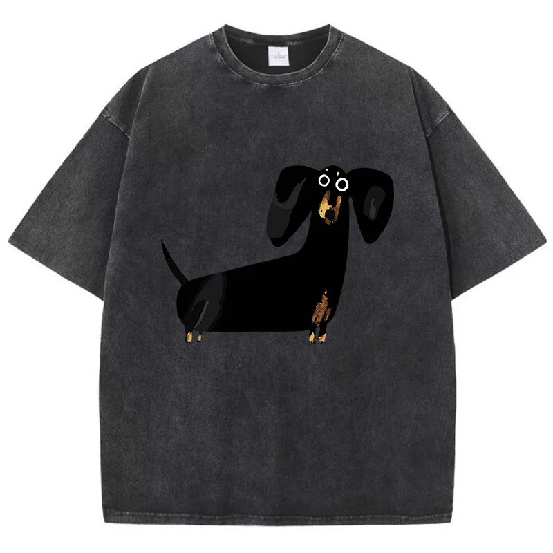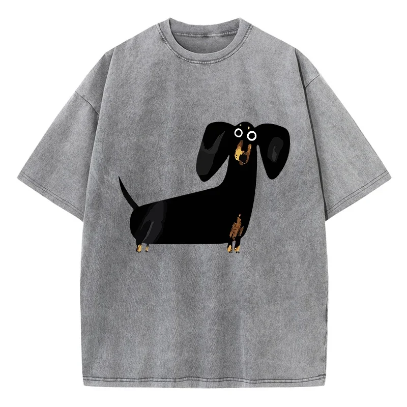 Funny Dachshund dog print women’s T-shirt. Oversized, acid-wash cotton top with O-neck design, perfect for casual summer outfits and relaxed wear.